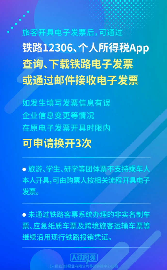 旅客開具電子發票后,可通過鐵路12306、個人所得稅App查詢、下載鐵路電子發票或通過郵件接收電子發票;如發生填寫發票信息有誤、企業信息變更等情況,在原電子發票開具時限內可申請換開3次。旅游、學生、研學等團體票不支持乘車人本人開具,可由購票人按相關流程開具電子發票。未通過鐵路客票系統辦理的非實名制車票、應急紙質車票及跨境旅客運輸車票等繼續沿用現行鐵路報銷憑證。