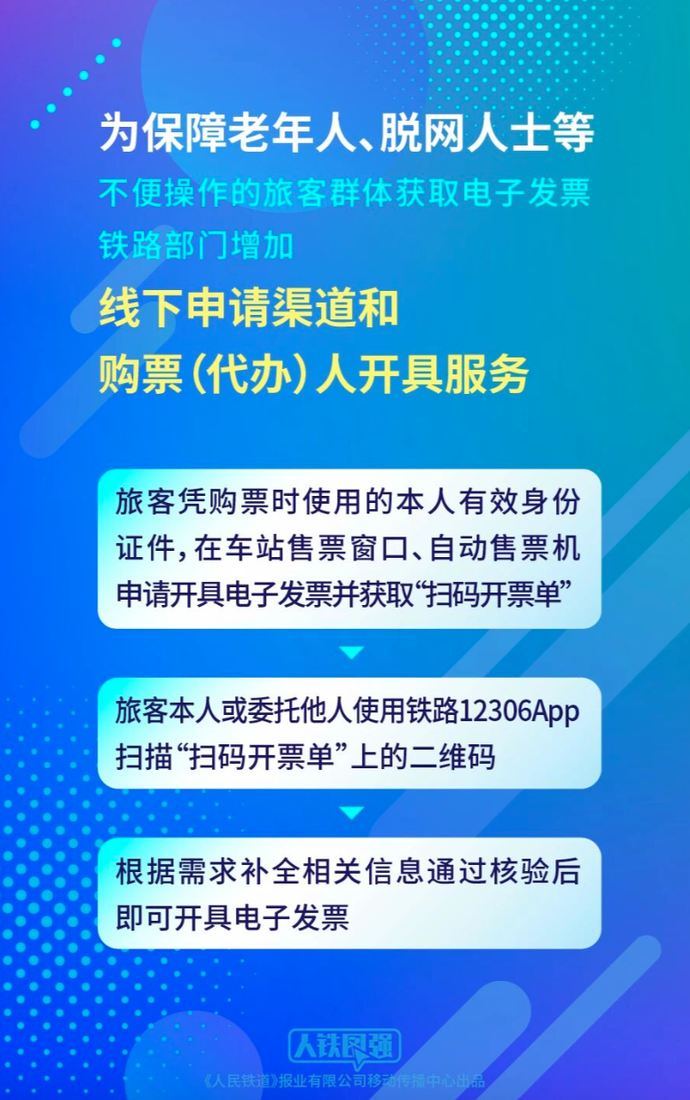 為保障老年人、脫網人士等不便操作的旅客群體獲取電子發票,鐵路部門增加線下申請渠道和購票(代辦)人開具服務。旅客憑購票時使用的本人有效身份證件,在車站售票窗口、自動售票機申請開具電子發票并獲取“掃碼開票單”后,旅客本人或委托他人使用鐵路12306App掃描“掃碼開票單”上的二維碼,根據需求補全相關信息通過核驗后即可開具電子發票。
