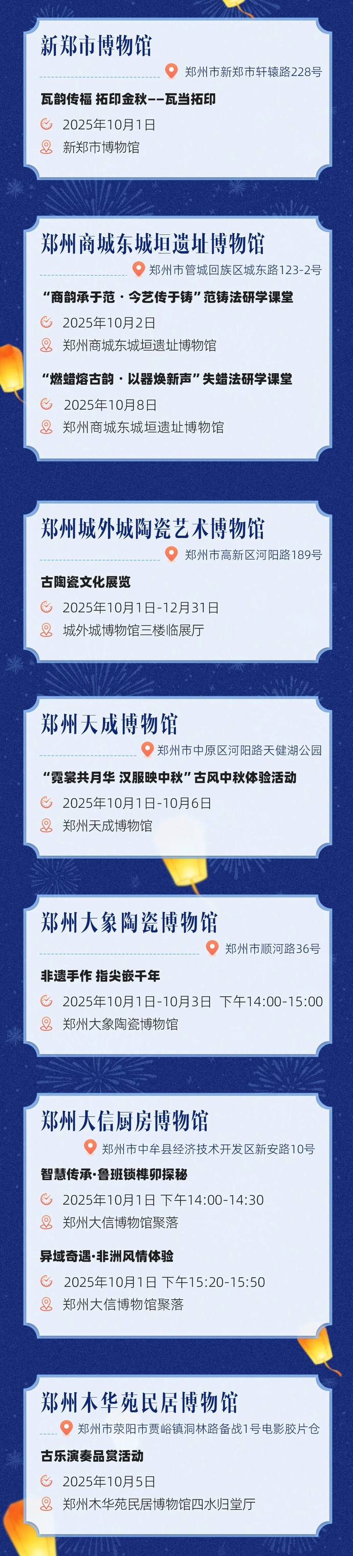 博物館奇妙夜繼續進行。10月6日晚,鄭州博物館開展“月滿山河 共團圓”2025中秋云游夜活動,預計人數達3000人。鄭州商代都城遺址博物院開展城隍廟里賞佳月活動。鞏義市博物館“宋宴映月?禮溯千年”雅宴等。鄭州市文物局還將開展“今宵月鄭圓”線上直播活動,傳承節日文化,打造城市記憶。
