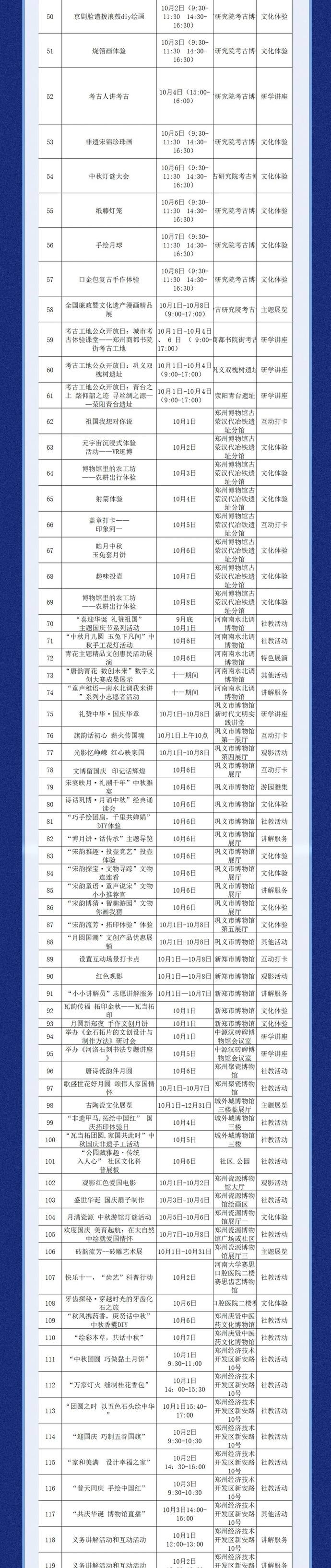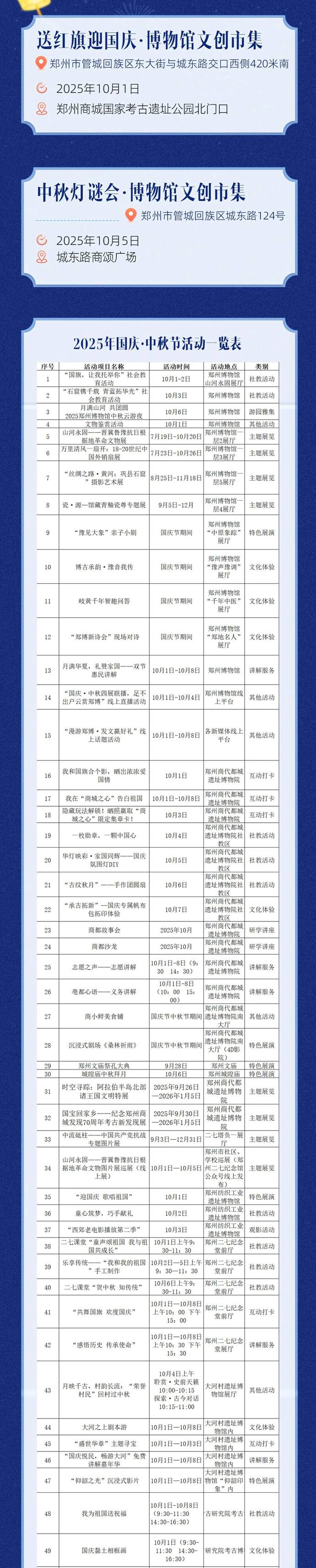 針對雙節期間市民文化需求激增的特點,在市區鄭州博物館、鄭州商代都城遺址博物院、鄭州二七紀念館等6家重點國有博物館實行延時開放服務,確保市民及游客有充足時間參與活動、感受文化魅力。