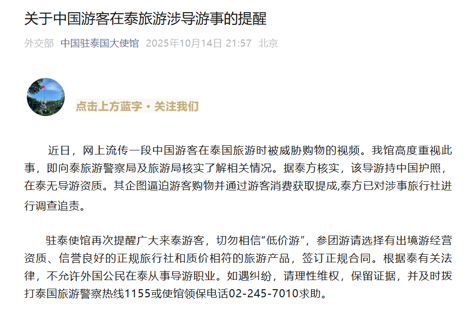 10月14日晚,中使館通報“中國游客在泰國旅游被威脅讓你回不了國”:導游持中國護照,在泰無導游資質,企圖逼迫游客購物獲取提成。
