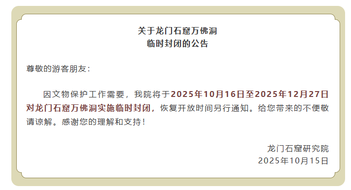 因文物保護工作需要,龍門石窟研究院將于2025年10月16日至2025年12月27日對龍門石窟萬佛洞實施臨時封閉,恢復開放時間另行通知。