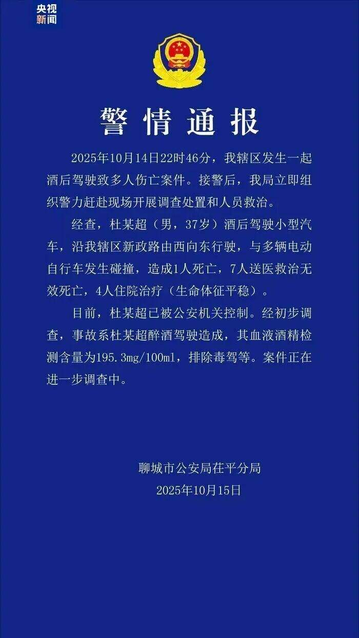10月15日,山東聊城警方通報:10月14日22時46分,轄區發生一起酒后駕駛致多人傷亡案件。經查,杜某超酒駕與多輛電動自行車發生碰撞,造成1人死亡,7人送醫救治無效死亡,4人住院治療(生命體征平穩)。目前,杜某超已被公安機關控制。經初步調查,事故系杜某超醉酒駕駛造成。