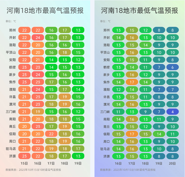 據河南氣象,16日夜間至17日,淮河以北將迎中到大雨,黃淮之間部分區域有暴雨,18日西部、南部仍有零星小雨。17日~20日全省偏北風4級,陣風6~7級,氣溫下降8℃左右,多地19日~20日凌晨最低溫降至個位數,洛陽19日最高溫僅11℃。