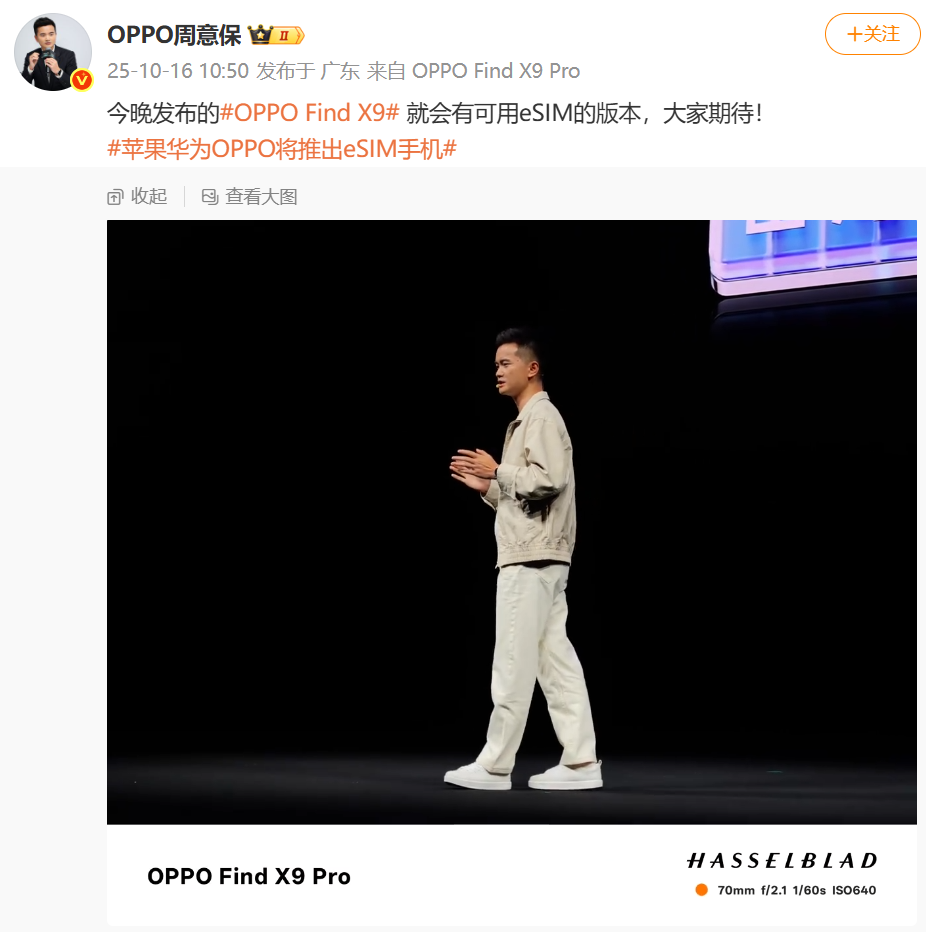 10月16日,OPPO Find系列產品負責人周意保透露,在今晚將要發布的新品OPPO Find X9會有eSIM版本。這也將是國產首款eSIM手機。近日,中國聯通、中國移動、中國電信先后官宣,已正式獲得開展eSIM手機運營服務商用試驗的批復。首款eSIM手機iPhone Air將于北京時間明天上午9點接受預購,而根據目前的消息,華為、OPPO等廠商也將推出eSIM手機。