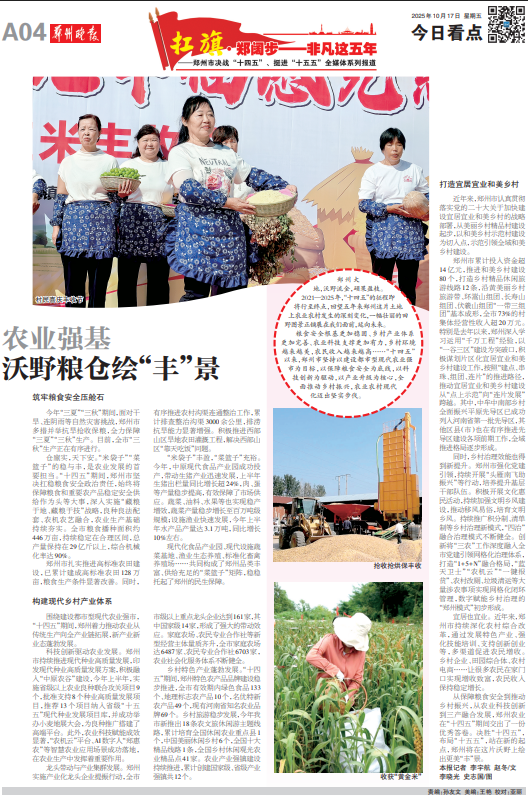 從保障糧食安全到推動鄉村振興,從農業科技創新到三產融合發展,鄭州農業在“十四五”期間交出了一份優秀答卷。決勝“十四五”,布局“十五五”,站在新的起點,鄭州將在這片沃野上繪出更美“豐”景。