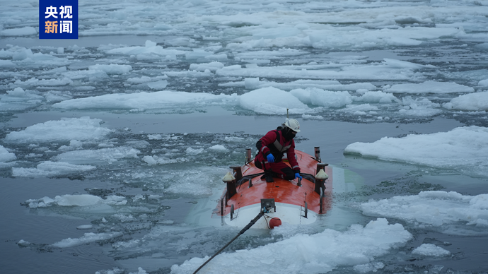 △“探索三號”在北極密集冰區破冰航行。